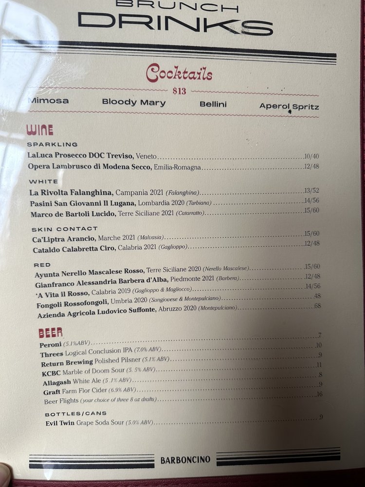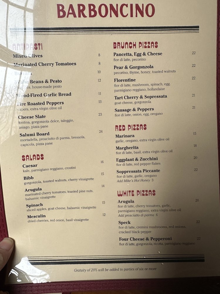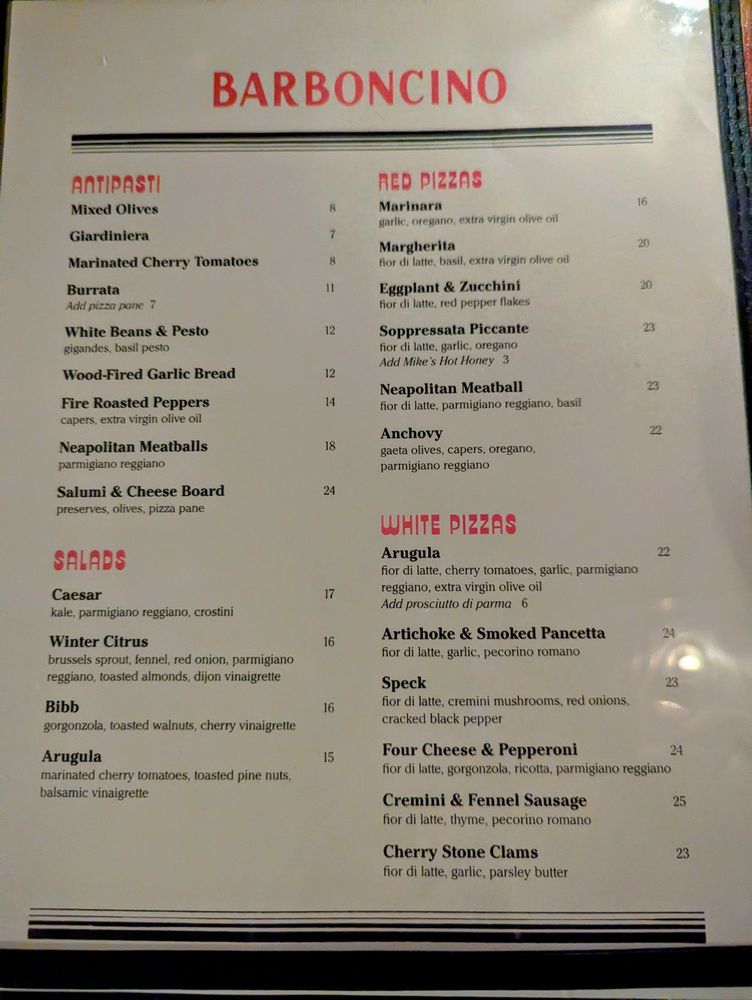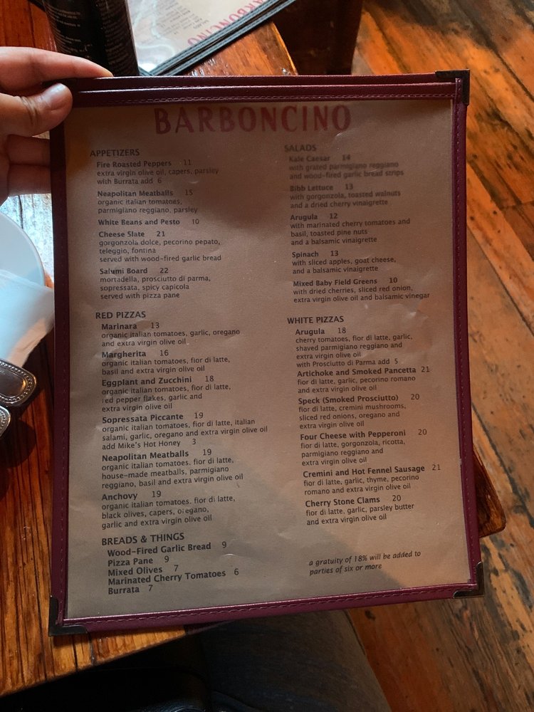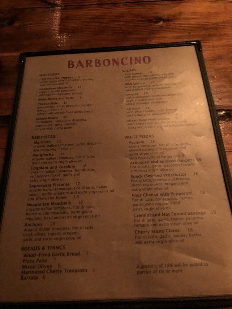 Barboncino Pizza & Bar in Brooklyn offers a diverse menu that caters to a wide range of preferences. Their appetizers like Fire Roasted Peppers and Neapolitan Meatballs set the tone for a delightful culinary experience. The salads, including options like Bibb Lettuce and Kale Caesar, provide a refreshing start to the meal. The real star of the show, however, is their pizza selection. From classic Margherita to unique combinations like Eggplant And Zucchini and Cherry Stone Clams, each pie is crafted with care and quality ingredients. Customers rave about the ambiance, service, and overall dining experience at Barboncino, making it a must-visit spot for pizza lovers in the area. With options for vegan and vegetarian diners, as well as a full bar and happy hour specials, this restaurant offers something for everyone. Don't miss out on the wood-fired garlic bread and White Beans & Pesto, as recommended by loyal patrons. Whether you're looking for a cozy date night spot or a family-friendly restaurant, Barboncino Pizza & Bar has you covered.